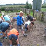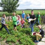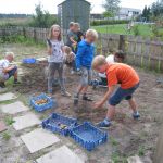 Die Beete werden neu eingerichtet, im Sinne der Fruchtfolge verlegen wir den Kartoffelacker in ein anderes Feld, ebenso das Gemüse. Mit den Steinplatten unterteilen wir die einzelnen Beete. Und auch der Kompost aus dem letzten Jahr wird zum ersten Mal umgesetzt. Dabei entdecken wir so allerlei Tiere.