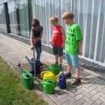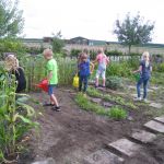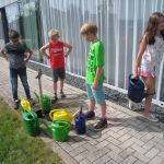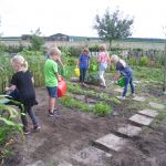 Das Jäten gehört dazu, aber noch lieber gießen wir, insbesondere an den heißen Frühsommertagen…an denen erproben wir auch unseren Barfuß-Fühlpfad, natürlich auf nackten Sohlen…