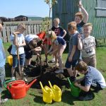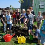 Nachdem auch der März noch recht winterlich war, haben wir erst im April nach den Osterferien die Beete angelegt und Kartoffeln, Zwiebeln, Kürbisse, Zucchini und Rharbarber gepflanzt bzw. gesät. Der viele Regen hat alles gut wachsen lassen und so haben wir in den AG-Stunden auch viel zu tun mit dem Jäten des Unkrauts.